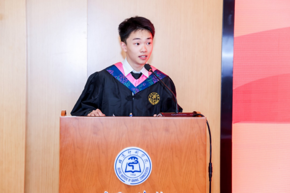 典礼伊始,研究生毕业生代表姜昊辰、本科生毕业生代表陈世勋依次上台发言。他们回望求学岁月,真挚表达了对母校和师长的感恩,并满怀憧憬地向青春致礼,与未来对话。