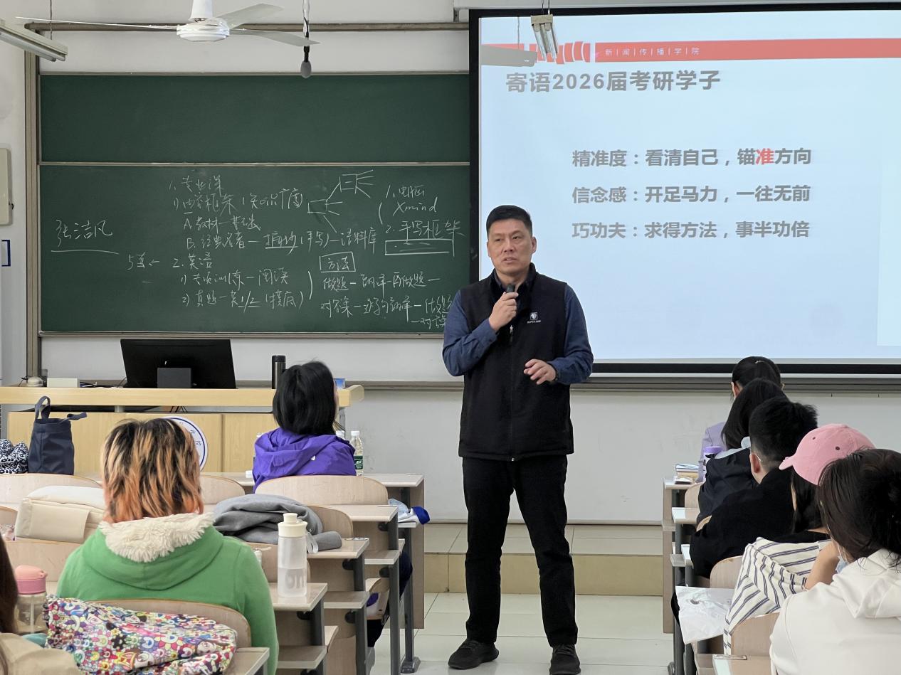 新闻传播学院副院长常昕剖析近几年学院考研录取情况,用详实数据为同学们呈现考研形势,提供精准择校建议。她强调,择校要综合考量个人实力、院校专业实力与招生政策等因素。在备考方面,她鼓励同学们尽早着手、循序渐进,稳步推进考研复习。