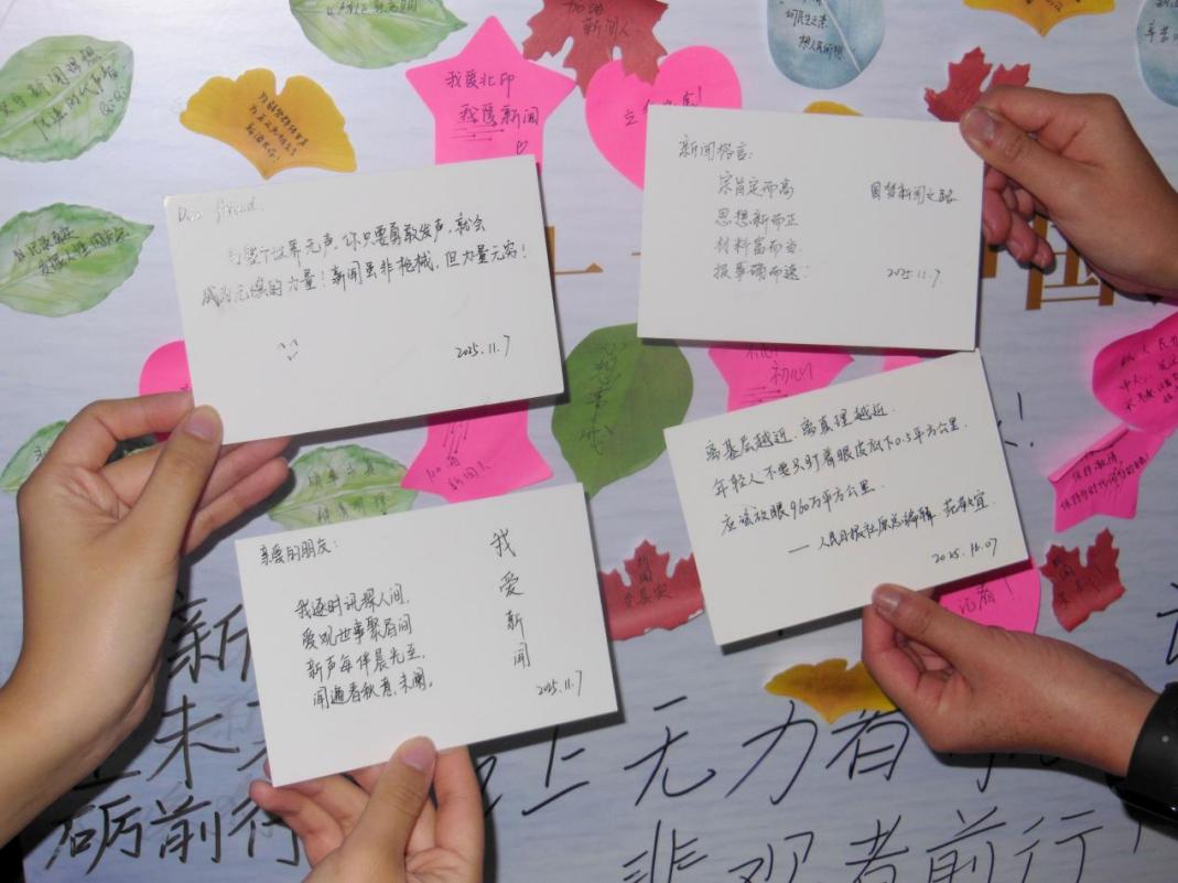 本次活动设置了“新闻理想墙”与“明信片漂流”两大核心环节,为学子们打造了一个兼具书写与倾听、表达与共鸣的交流空间。在“新闻理想墙”前,同学们纷纷驻足,或提笔写下对新闻事业的憧憬与誓言,或摘录触动人心的行业箴言,一笔一画间,满是年轻一代对新闻理想的执着追求、对职业责任的深刻理解。而“明信片漂流”中一张张承载着真挚感悟的卡片在学子间传递,字里行间既有对前辈记者的崇高敬意,也有对自身未来职业道路的美好期许,更有对新闻精神的独到诠释,让澎湃炽热的新闻理想在笔尖沉淀、在交流中不断升华。