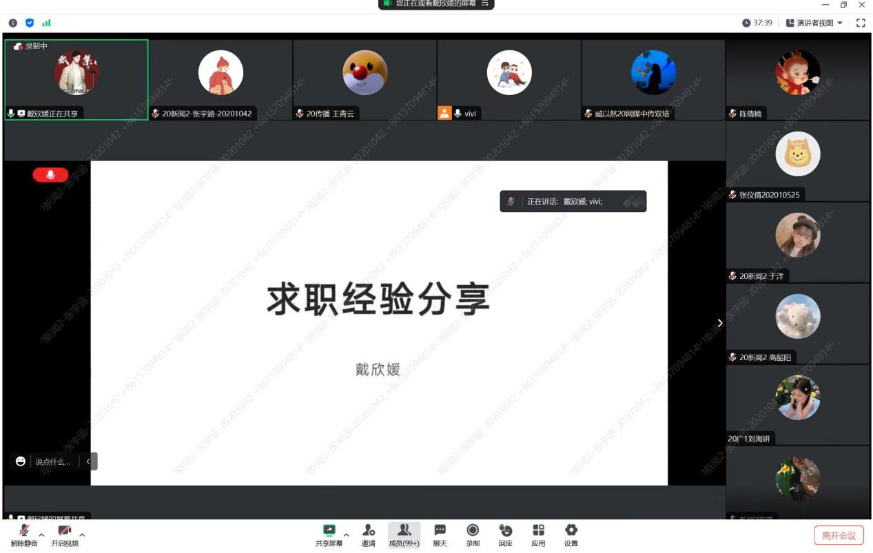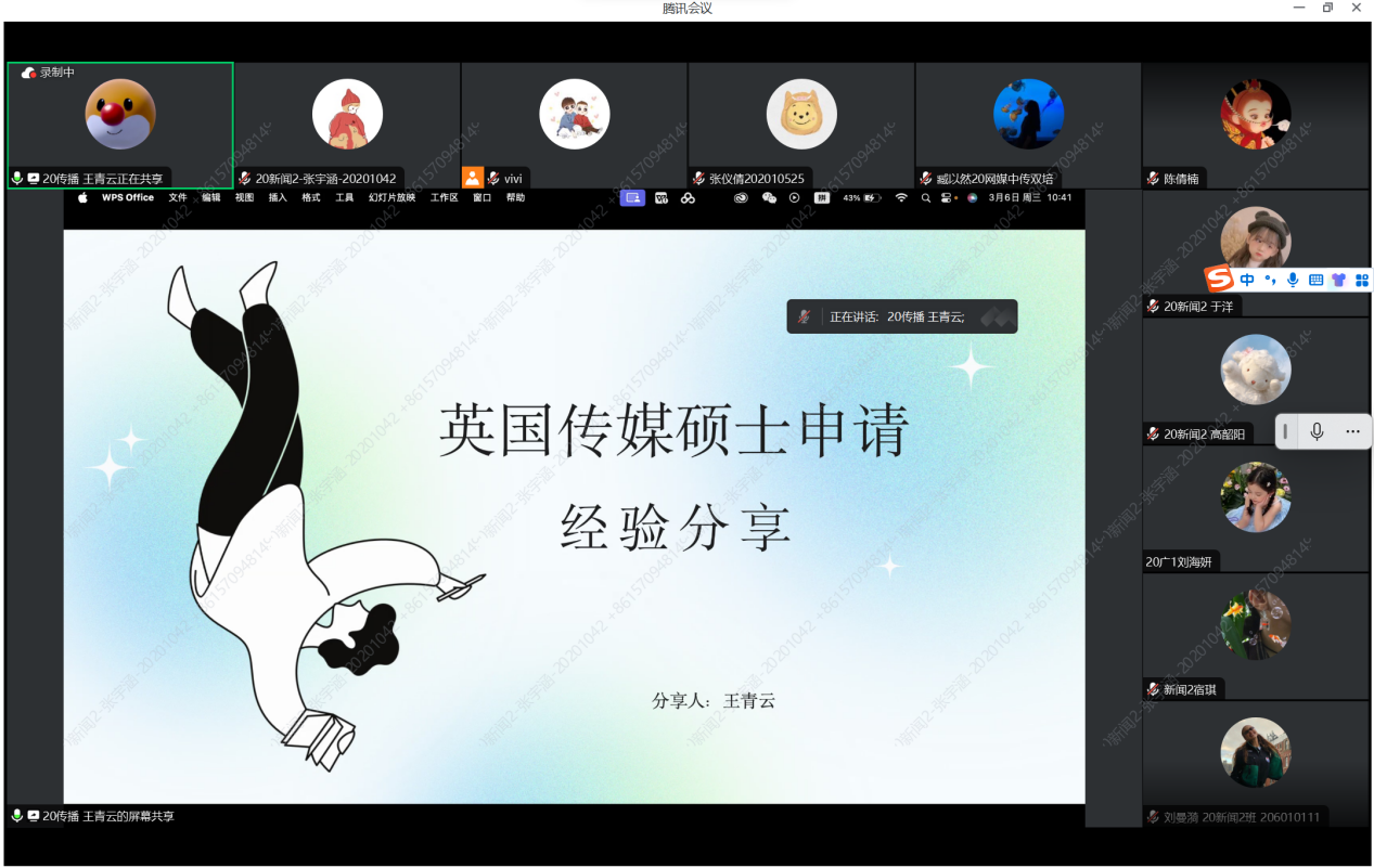 “朋辈引领”促成长,3月6日上午,学院邀请20级升学就业代表王青云和19级优秀毕业生代表戴欣媛为20级本科生做升学就业经验分享。王青云同学以自己国外升学的经历为蓝本,从国外升学申请流程、选校定校、申请材料和注意事项四个方面详细介绍了境外求学择校的心得,为有出国意向的同学提供了有益借鉴。戴欣媛同学结合自己的求职历程和考公上岸的经历,为同学们提供了求职就业的心得历程,她强调了确定求职方向的重要性,并鼓励同学们要广泛收集资料,保持耐心、恒心和平常心去学习,及时调整自我心态,最终一定能找到属于自己的理想职业。