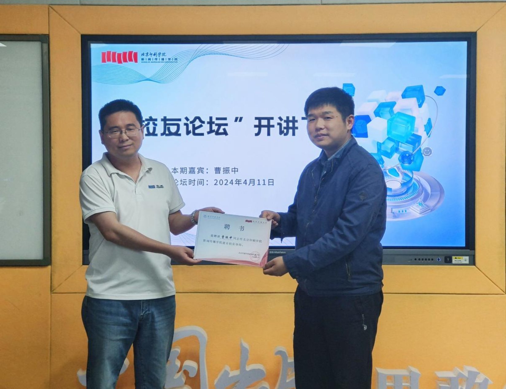 新闻传播学院副院长谷征为曹振中颁发北京印刷学院新闻传播学院就业创业导师聘书。曹振中表示,将继续关注和支持学校发展,为未来的就业创业提供力所能及的指导和帮助。新闻出版学院20余名本硕学生代表参与本次论坛,论坛由学工组长张燕玲主持。