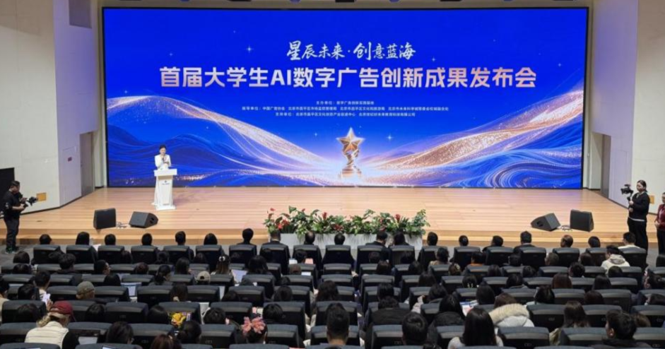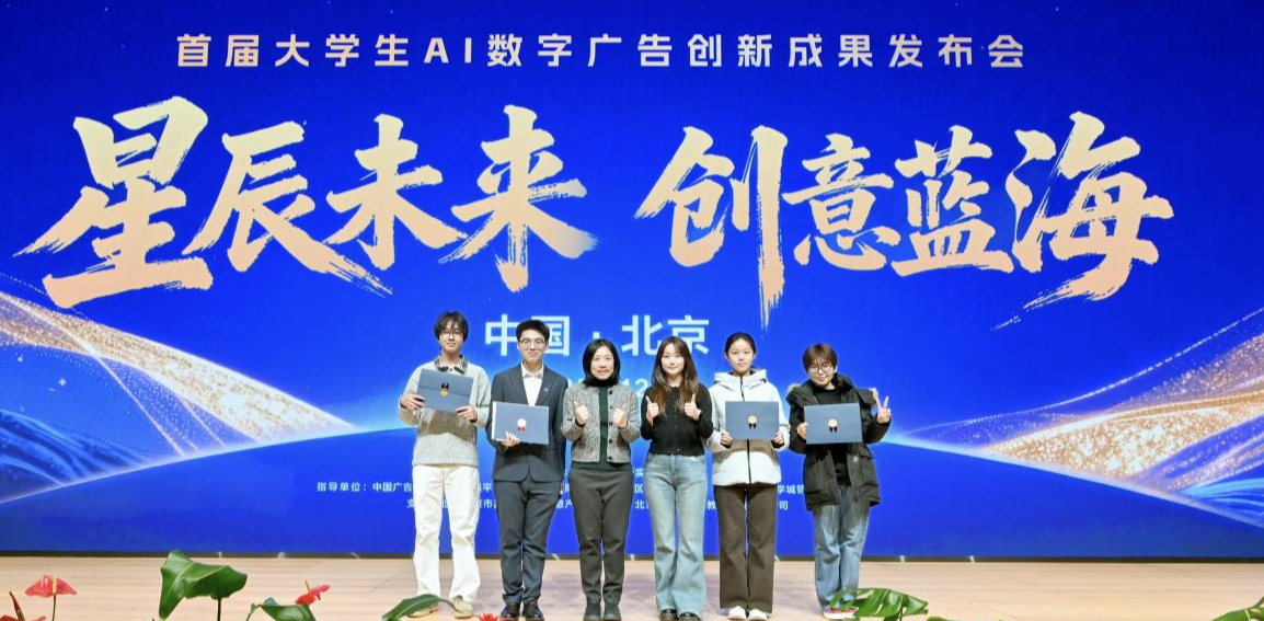12月19日,“星辰未来·创意蓝海”首届大学生AI数字广告创新成果发布会在北京市昌平区数字广告创新实践基地举办,新闻传播学院共有5部学生作品入围获奖,涵盖典范作品奖、新锐力量奖及入围提名奖等多个类别。新闻传播学院副院长常昕、获奖作品指导教师毛鑫及获奖学生代表共同参加了成果发布会暨颁奖仪式。